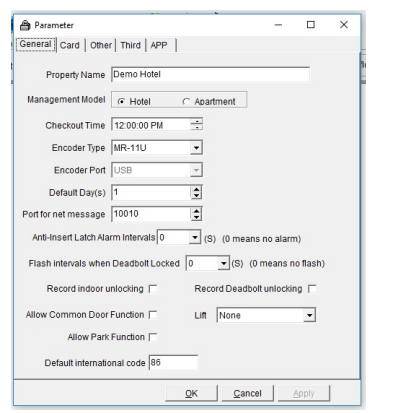 Default international code: Displays default international code to send mobile keys if Bluetooth locks are installed.
